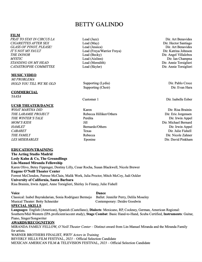 Betty is a Lin-Manuel Miranda Fellow, and trained at the two-time tony award winning Eugene O’Neill Theater Center, where she participated in the Theatermakers Intensive program. She graduated from the University of California, Santa Barbara with a B.F.A in Acting. Her additional training includes improv at The Groundlings, studying with Lesly Kahn & Co. in Los Angeles, and with The Acting Studio Madrid located in Madrid, Spain.